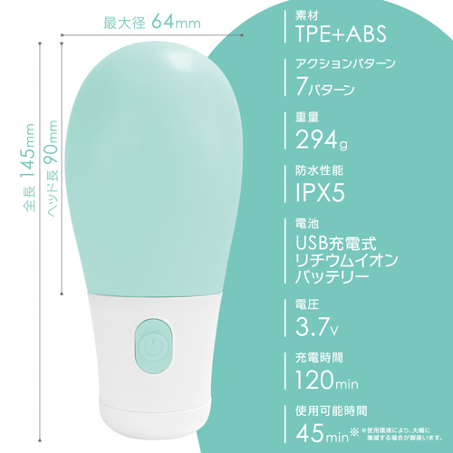120分の充電時間で最大45分連続使用が可能(使用環境により大幅に増減します)実用性の高い7パターンの振動が楽しめます。