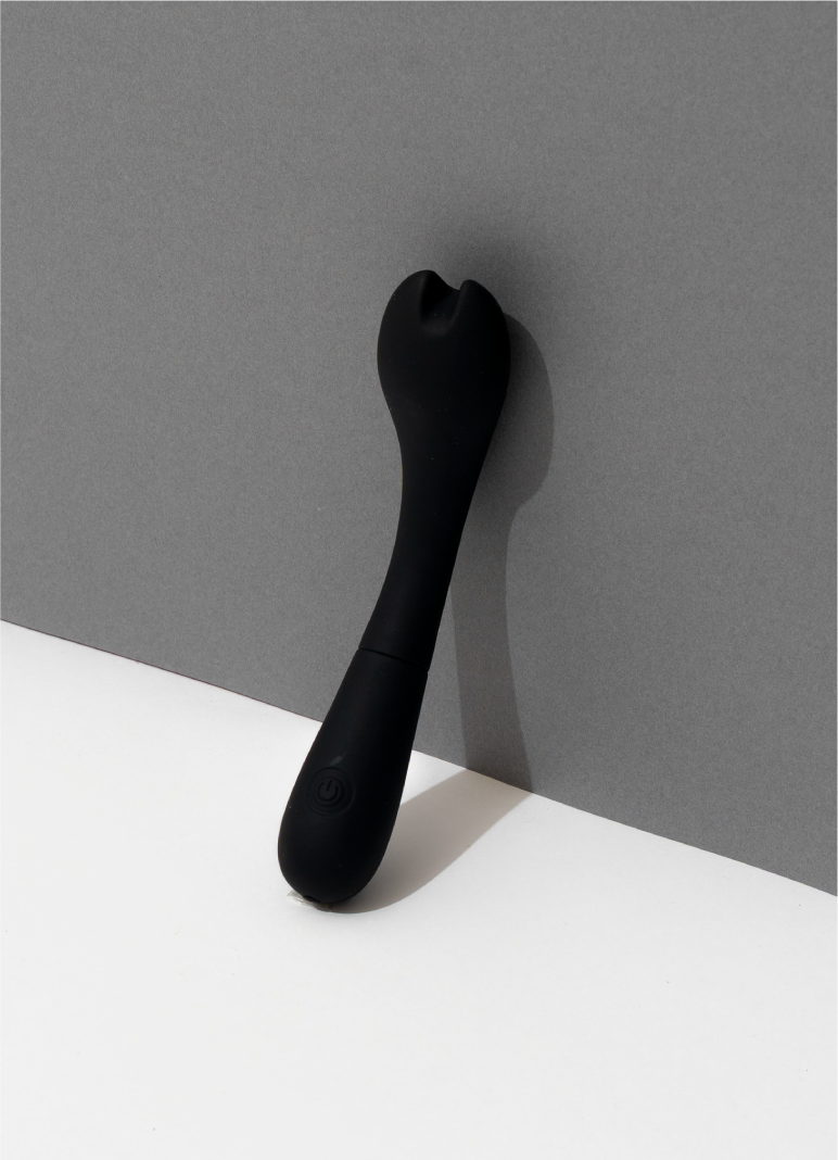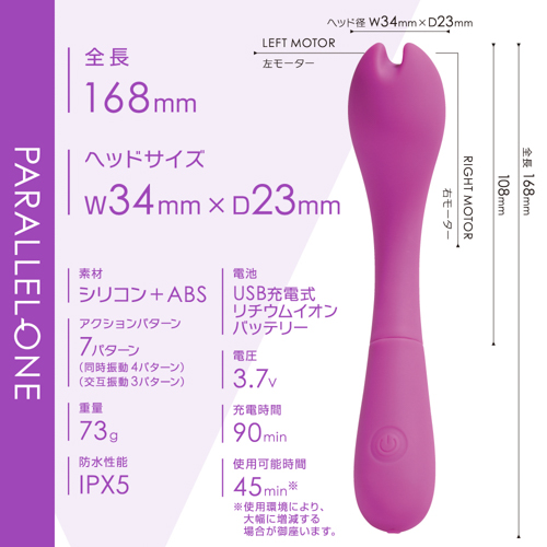 プレジャースポットに合わせた角度と日本人に合ったサイズ感が特徴です。先端は挟んで刺激も出来るように溝を付けています。先端振動は同時振動・個別振動合わせて7パターン。90分充電で最大45分使用可能なパワフルなリチウムイオンバッテリーを搭載。
